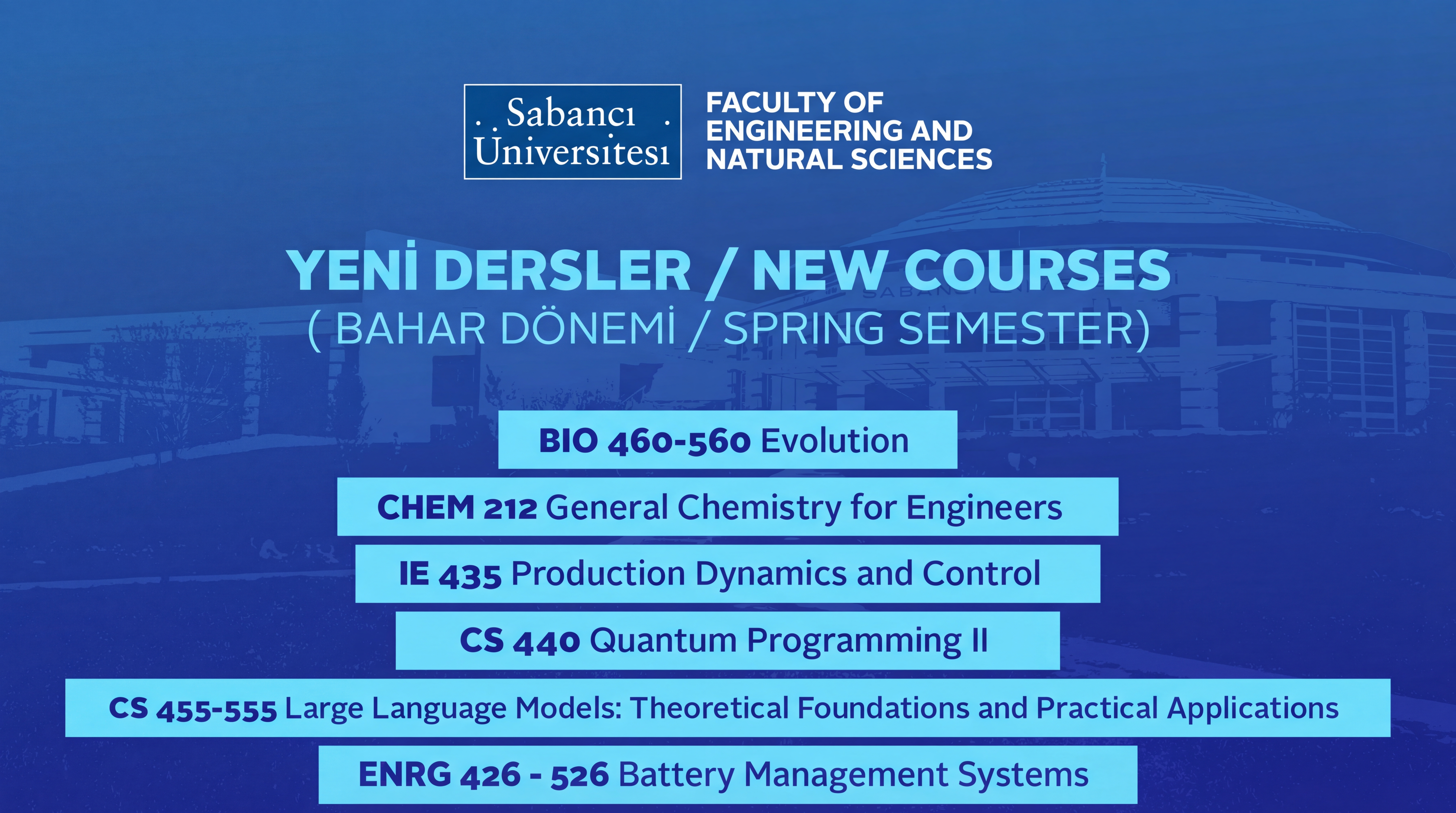 The new courses opened for the Spring Semester and the faculty members who will teach these courses are as follows: Ogün Adebali – Evolution, Hayriye Ünal - General Chemistry for Engineers, Murat Fadıloğlu – Production Dynamics and Control, İnanç Arın - Large Language Models: Theoretical Foundations and Practical Applications, Özlem Salehi Köken – Quantum Programming II, and Melih Türkseven & Siro Team - Battery Management Systems.
