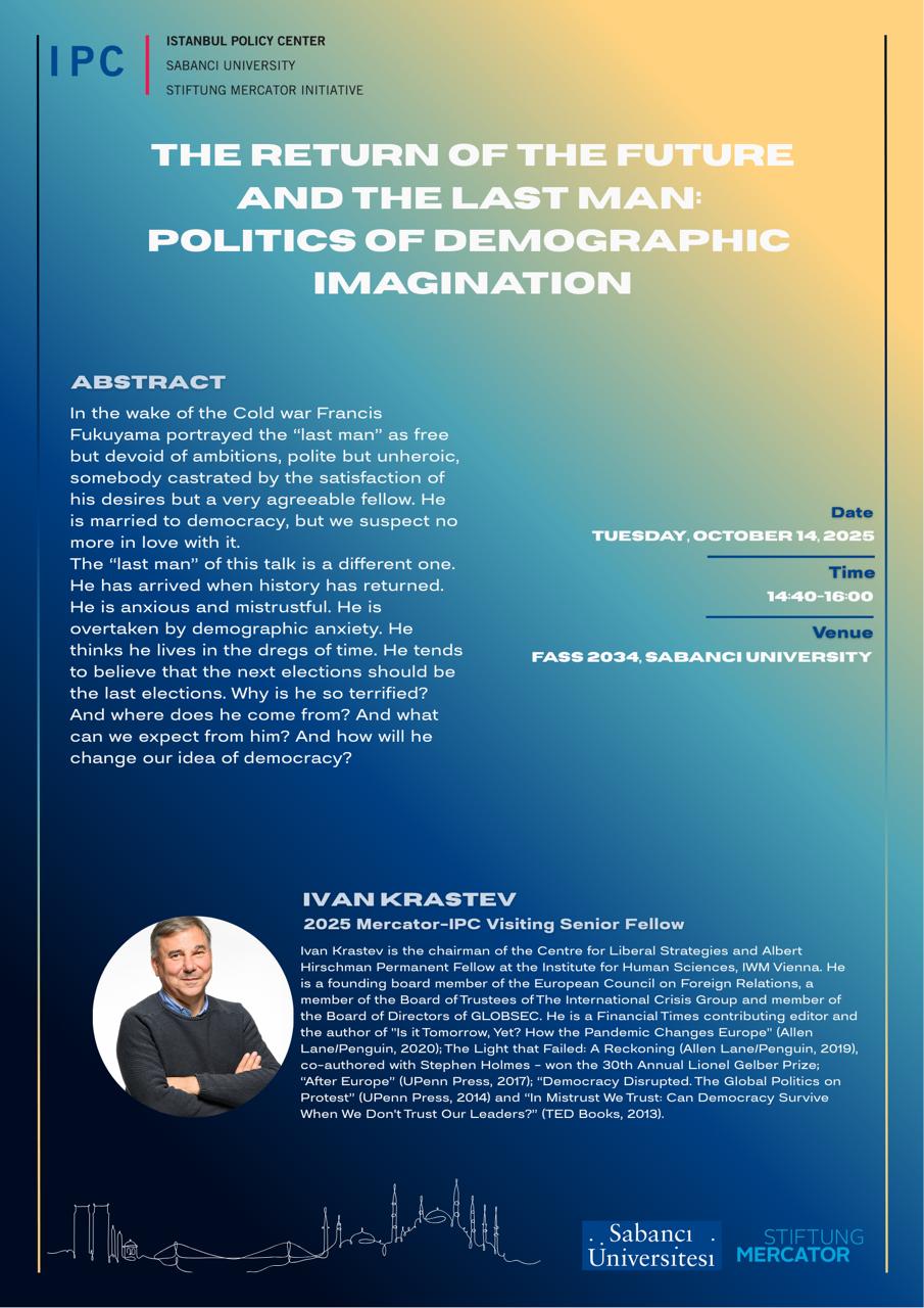 Sabancı University 2025 Mercator-IPC Visiting Senior Fellow Ivan Krastev will deliver a seminar titled “The Return of the Future and the Last Man: Politics of Demographic Imagination.” The event will be moderated by Prof. Meltem Müftüler-Baç, Dean of FASS, and will take place on Tuesday, October 14, 2025, from 14:40 to 16:00 at FASS 2034.