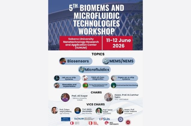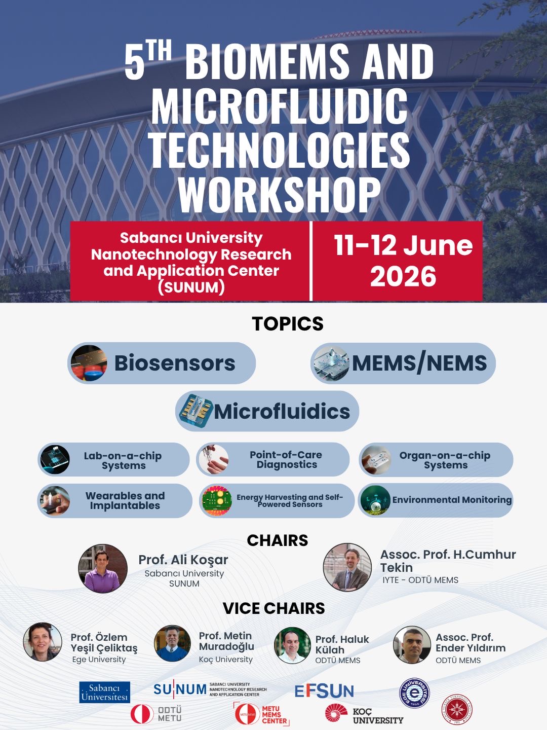 5. BioMEMS ve Mikroakışkan Teknolojiler Çalıştayı 11–12 Haziran 2026 tarihlerinde Sabancı Üniversitesi Nanoteknoloji Araştırma ve Uygulama Merkezi (SUNUM)’da gerçekleştirilecektir.