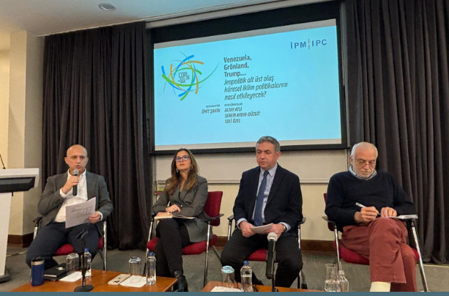 İstanbul Politikalar Merkezi (İPM) tarafından COP31 hazırlıkları kapsamında başlatılan etkinlik serisinin ilk paneli, “Venezuela, Grönland, Trump… Jeopolitik Altüst Oluş Küresel İklim Politikalarını Nasıl Etkileyecek?” başlığıyla gerçekleştirildi. Ümit Şahin’in moderatörlüğünde düzenlenen panele Senem Aydın-Düzgit, Altay Atlı ve Soli Özel konuşmacı olarak katıldı.
