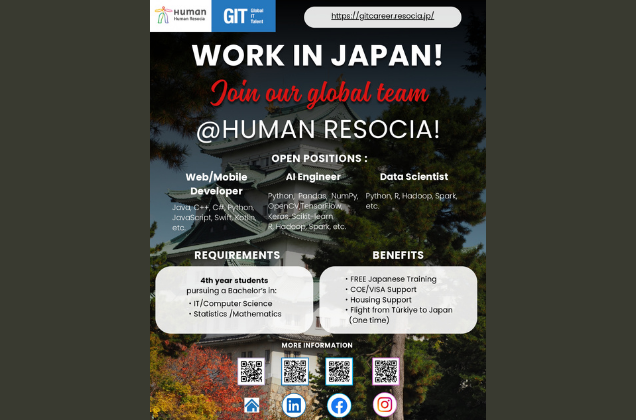 Uluslararası partnerimiz Human Resocia iş birliğiyle, öğrencilerimize Japonya’da teknoloji alanında kariyer fırsatları sunulmaktadır. Bu program kapsamında, adaylar Japonya’nın önde gelen teknoloji şirketlerinde Yazılım Mühendisi (Software Engineer) ve Veri Bilimci (Data Scientist) pozisyonlarında çalışma imkânı elde edebilecektir. Program; çalışma vizesi, Japonca dil eğitimi ve taşınma desteği gibi kapsamlı olanaklar sunmaktadır.
