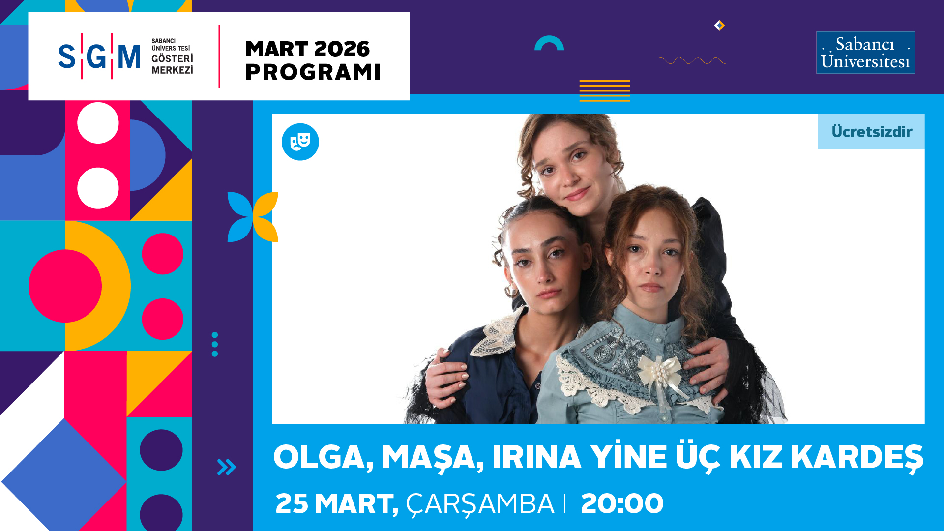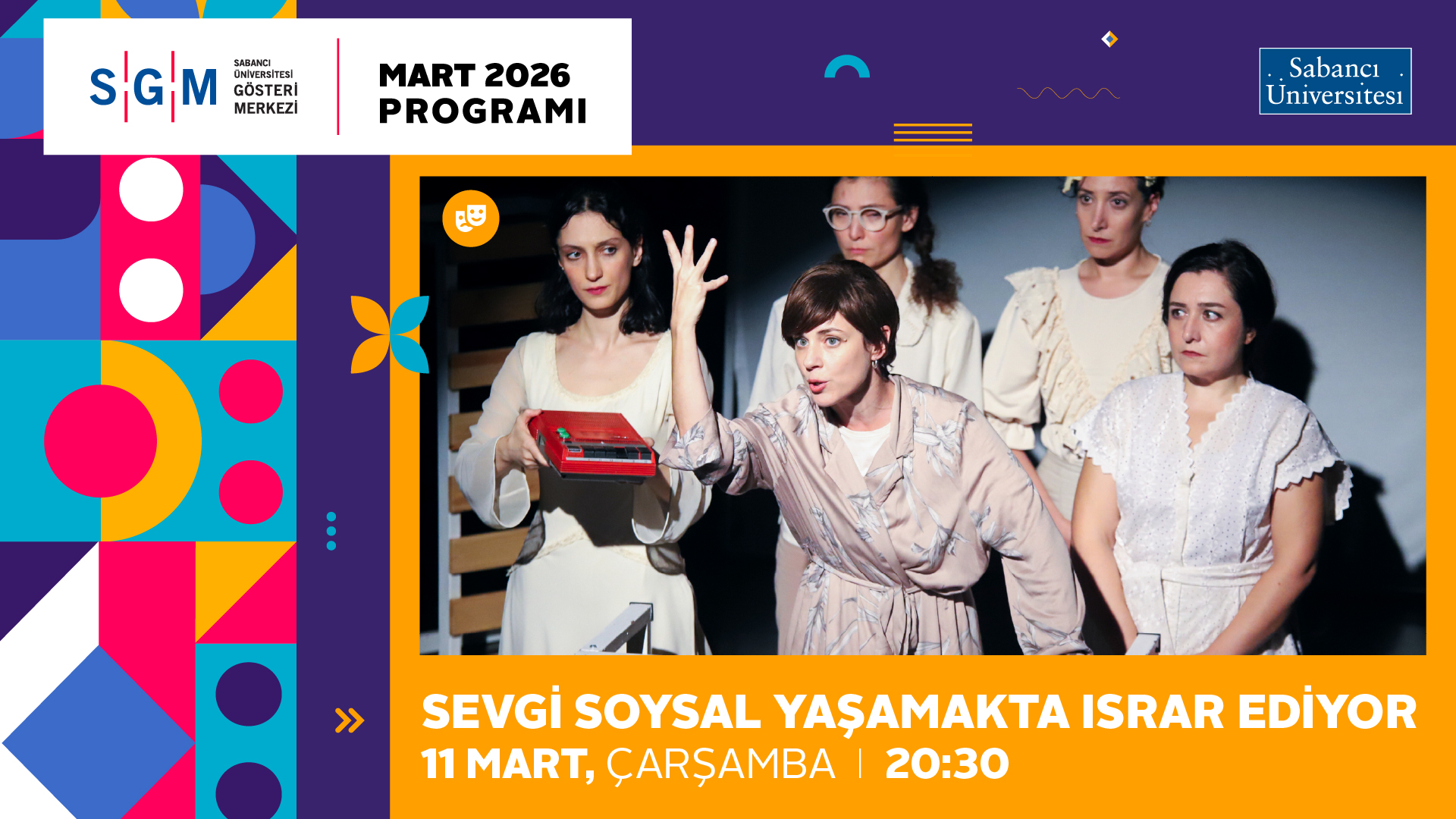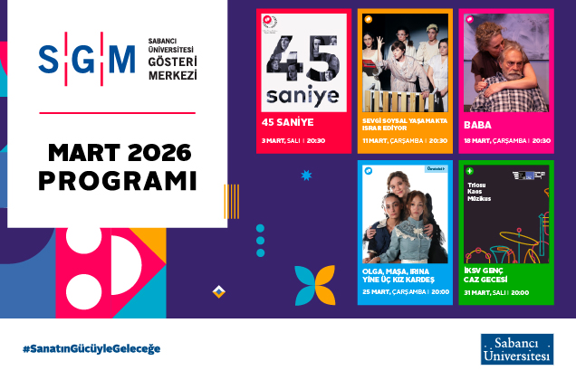 Sabancı Üniversitesi Gösteri Merkezi (SGM), Mart ayında tiyatrodan caza uzanan seçkisiyle kampüsü yine sanatın buluşma noktası hâline getiriyor. Kadınlık deneyimlerinden hafızaya, edebiyattan müziğe uzanan program; izleyiciyi hem düşündüren hem de duygusal olarak içine çeken yapımları bir araya getiriyor.