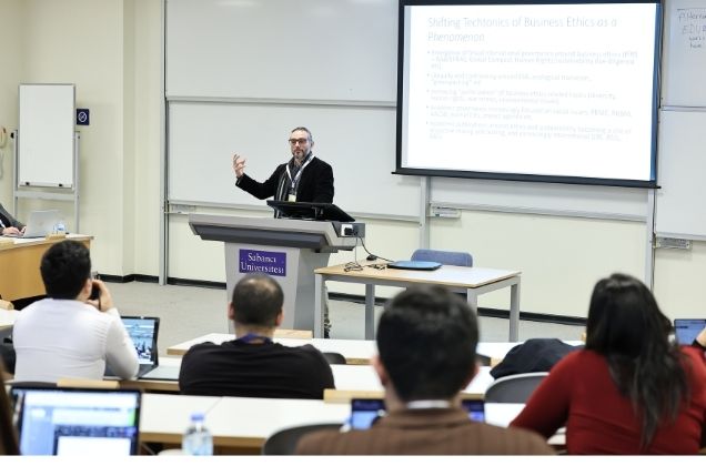 Sabancı Üniversitesi, 12–13 Aralık 2025 tarihlerinde Sabancı Business School ile dünyanın önde gelen akademik dergilerinden Journal of Business Ethics (JBE) iş birliğinde bir Makale Geliştirme Atölyesi ve Yazım Kampı’na ev sahipliği yaptı. Yönetim Bilimleri Fakültesi’nde iki gün süren atölyede, iş etiği, sürdürülebilirlik, kurumsal sosyal sorumluluk ve insan hakları gibi alanlarda akademik yazım ve yayımlama süreçlerine odaklanan sunumlar, oturumlar ve etkileşimli çalıştaylar gerçekleştirildi.