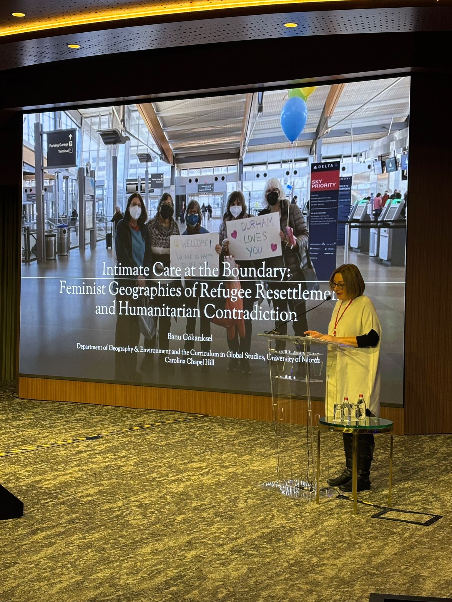 Konferansın ilk gününde konferansın açılış konuşmasını University of North Carolina at Chapel Hill’de Coğrafya ve Çevre profesörü ve Küresel Çalışmalar Programı Başkanı Banu Gökarıksel yaptı. Gökarıksel, “Sınırda Yakın Bakım: Mültecilerin Yeniden Yerleştirilmelerinin Feminist Coğrafyaları ve İnsani Yardım Çelişkisi” başlıklı konuşmasında, ABD’deki mülteci yeniden yerleştirme süreçlerinde gönüllülerin kişisel bakım pratikleri ile kurumların “sağlıklı sınırlar” ve hızlı özerklik beklentileri arasındaki gerilimi tartışmaya açtı. Neoliberal ve sömürgeci insani yardım mantıklarının bu bakım ilişkilerini biçimlendirme şekillerini gönüllülerin bu çelişkileri duygusal emek ve direniş pratikleriyle müzakere ediş biçimlerini anlattı Açılış oturumunun moderasyonunu Sabancı Üniversitesi Öğretim Üyesi Aslı İkizoğlu Erensü yaptı.