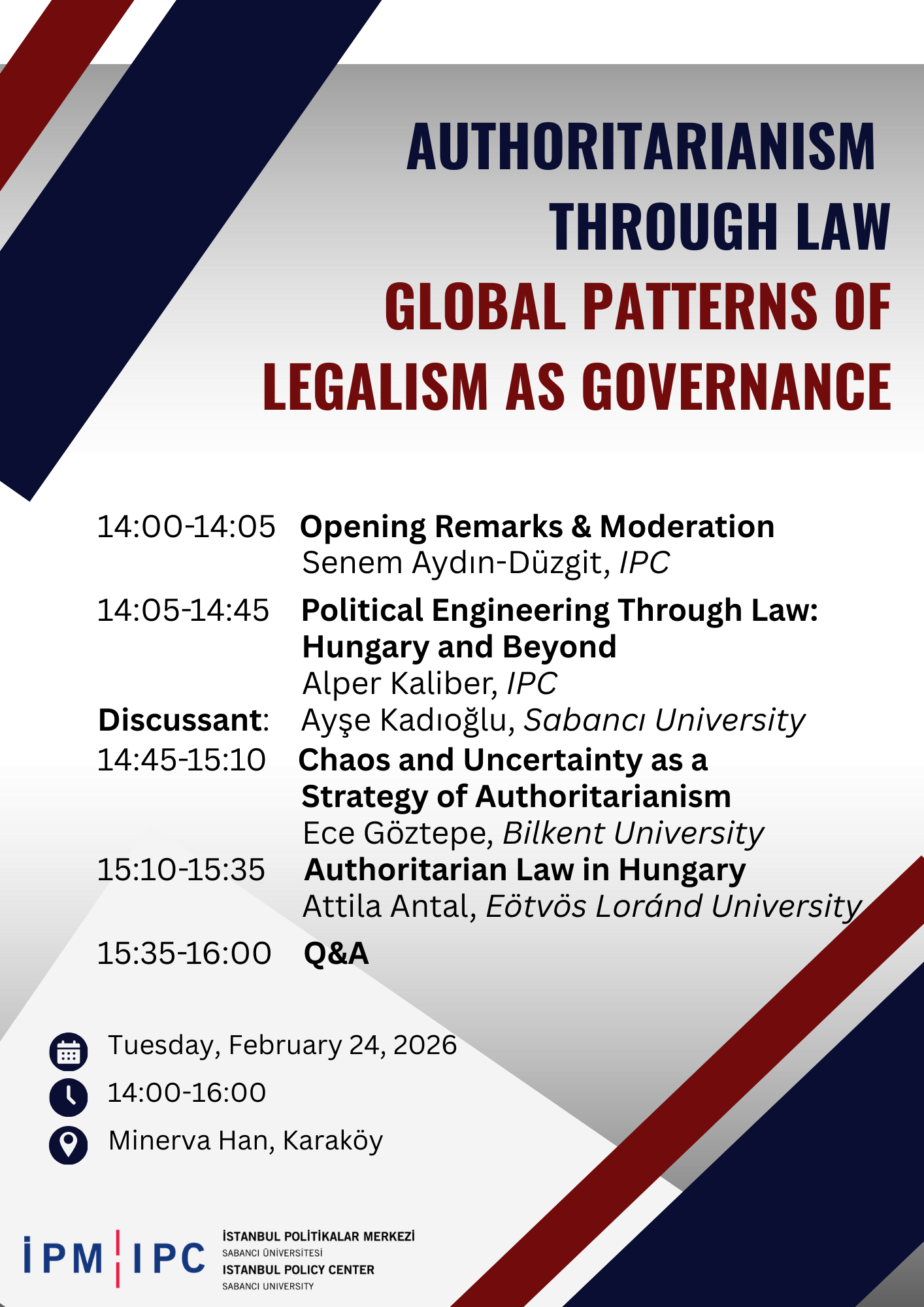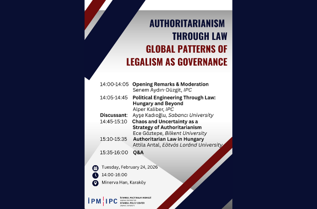Istanbul Policy Center (İPM), 24 Şubat’ta İPM Karaköy’de düzenlenecek “Authoritarianism Through Law: Global Patterns of Legalism as Governance” başlıklı panelle güncel siyaset tartışmalarının önemli bir boyutunu ele alıyor. Panel, İPM Kıdemli Uzmanı Alper Kaliber’in moderatörlüğünde gerçekleştirilecek.